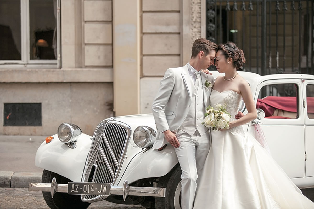 新郎新婦のレンタル衣裳(新郎40,000円分・新婦100,000円分を含む)、日本人ヘアメイク兼コーディネーター、50カットの画像データ、造花ブーケ&ブートニア、送迎が含まれます。詳細は本ページの「含まれるもの」をご確認ください。